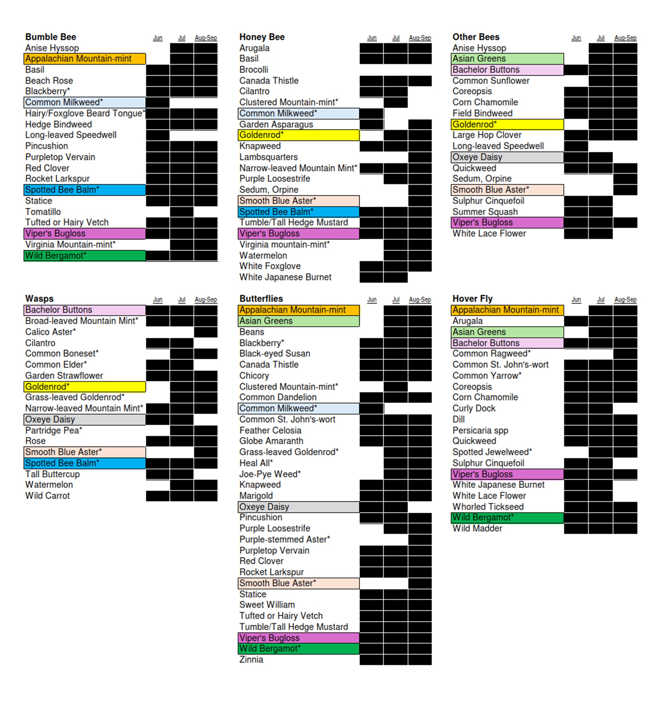 Table 1. The flowers most favored by our six insect groups, based on observational data from all farms and all outings. Lists are alphabetical and only include those flowers with notably higher than average visitation rates by the given insect groups. Plant species native to the Hudson Valley are marked with an asterisk. Colored boxes highlight those species found on three or more lists. Black blocking indicates flowering times observed during the season. CLICK ON IMAGE FOR ENLARGEMENT.