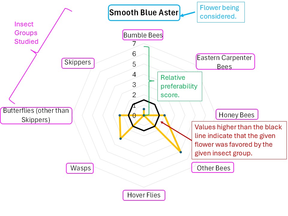 Figure 12. Explanation of a radar diagram illustrating insect preferences for a particular flower. The names of the various insect groups studied is displayed around the circumference. The distance from the center point to the edge reflects the strength to which the respective insect group favored the particular flower by each insect group. The dark black circle indicates what would be a slightly above average favorability for that particular insect group across all flowers. Finally, the orange zig-zag indicates the data for the particular flower. In this case, Smooth Blue Aster was highly favored by ‘other bees’, and somewhat favored by wasps and Honey Bees.