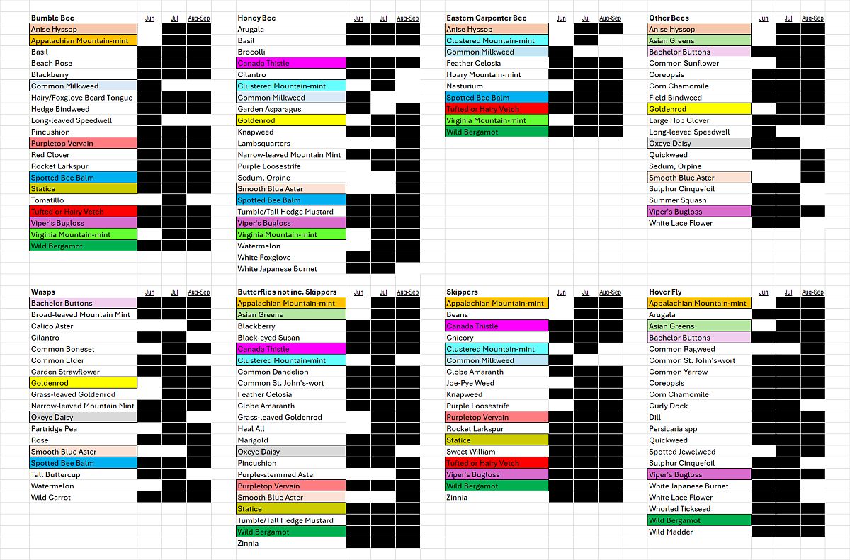 Table 1. The flowers most favored by our six insect groups, based on observational data from all farms and all outings. Lists are alphabetical and only include those flowers with notably higher (>=2x average) than average visitation rates by the given insect groups and at least 5 minutes of observation time. Plant species native to the Hudson Valley are marked with an asterisk. Colored boxes highlight those species found on three or more lists. Black blocking indicates flowering times observed during the season. CLICK ON IMAGE FOR ENLARGEMENT.