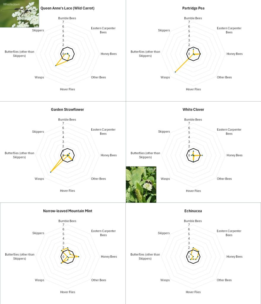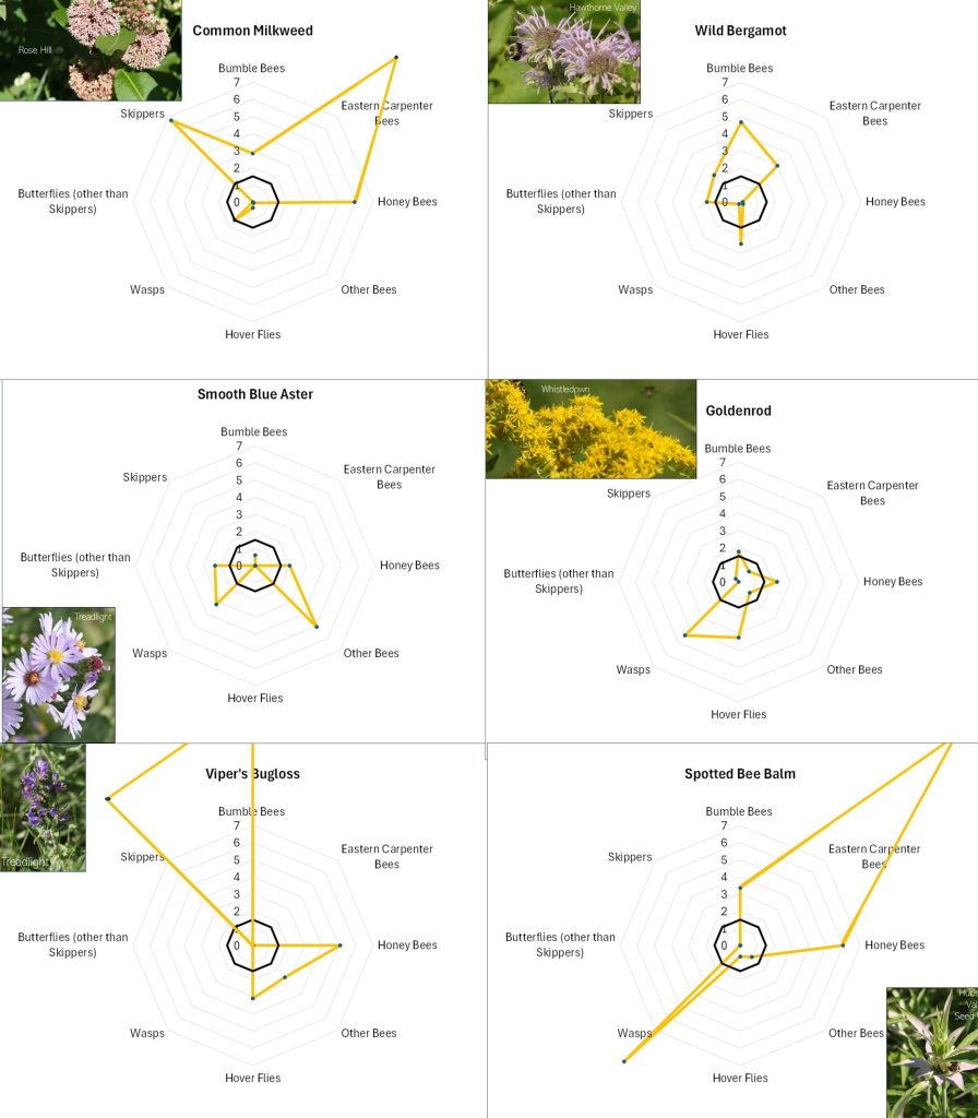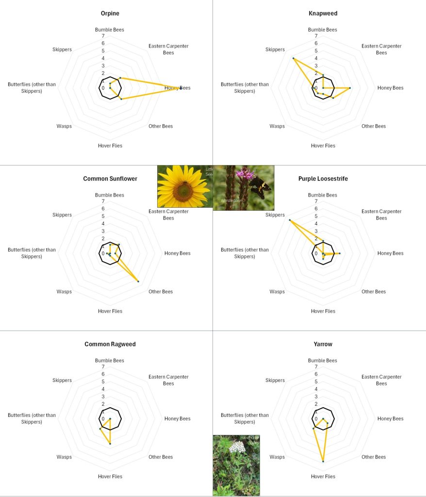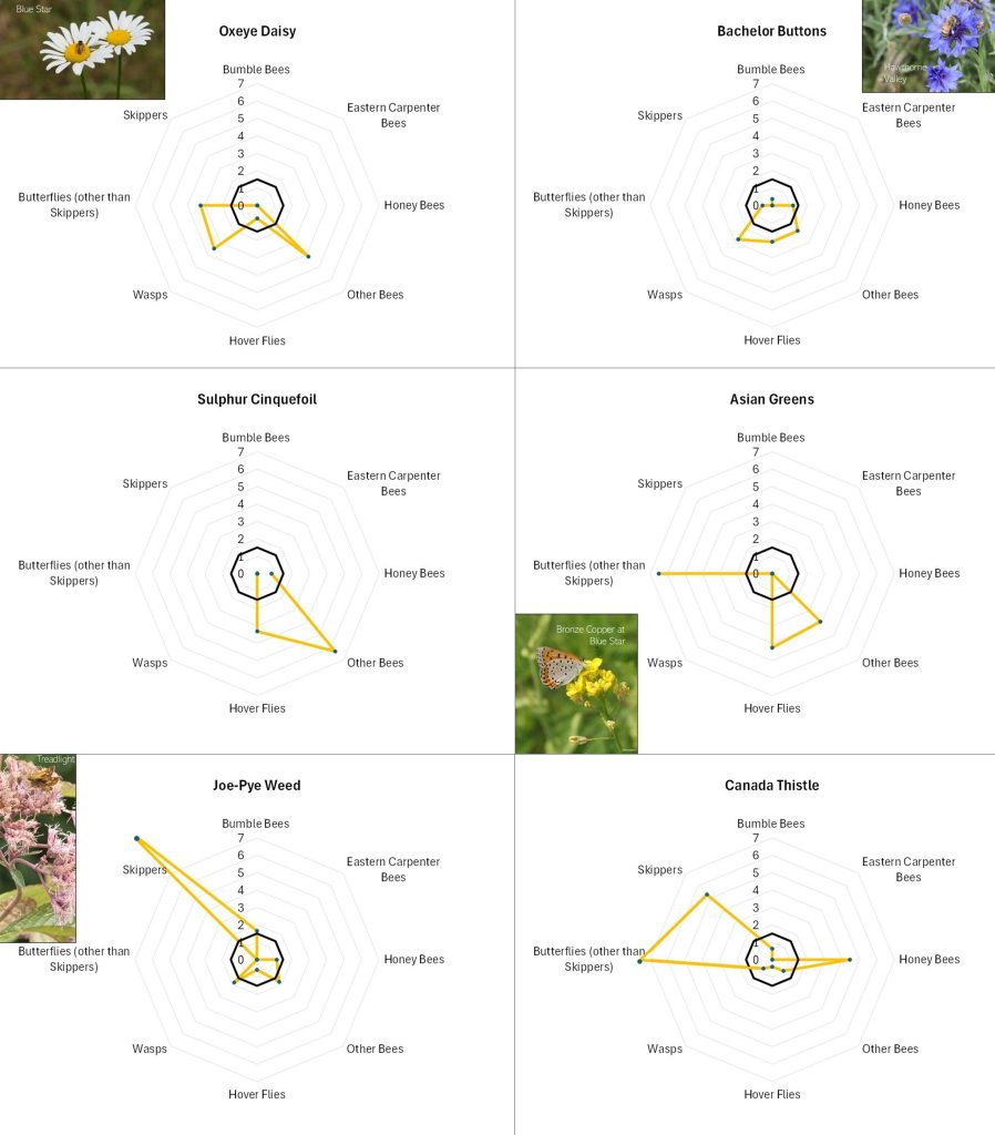 Flowers with different offerings display different shapes on the radar graph, and scanning such images can quickly illustrate differences in the preferences associated with each flower. For example, in looking at Figure 13A, Common Milkweed’s wide-ranging appeal to larger insects (i.e., butterflies, bumble bees, carpenter bees and Honey Bees) is easily noted, as is the appeal of goldenrod (Fig. 13A), Sulphur Cinquefoil (Fig. 13B) and Bachelor’s Button (Fig. 13B) to the shorter-tongued creatures.
