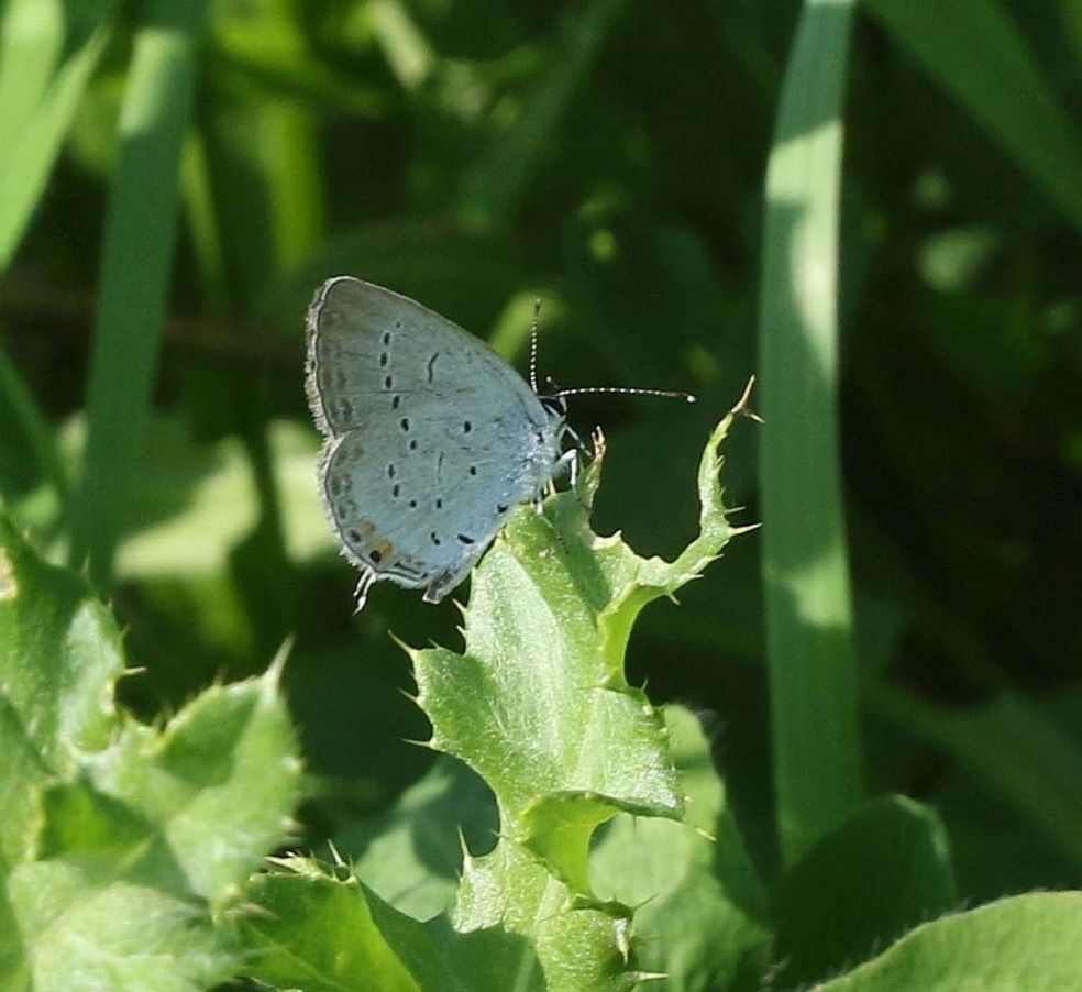 An Eastern Tailed-blue (affectionately, we call these ETBs) with its wings closed. This is a photo from another farm, but it shows the species’ side view well.