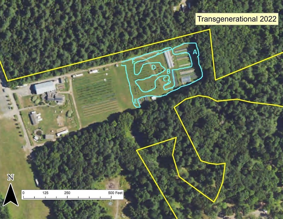Aerial photo of Transgenerational Farm with the approximate route taken for the botany survey in sky blue; capital letters reference locations from which the following habitat photos were taken.The core of the farm is an area of approximately one acre of mixed vegetable beds, supplemented by some greenhouses (looking west from Point A on the map)There were also some cut flower beds (looking southeast from Point B on the map)The area west of the greenhouses is home to a small flock of chickens and the vegetation is a savanna-like patchwork of mowed lawn, unmowed weeds, and widely-spaced small trees (looking north from Point C on the map)Further west are rows of berries (looking west from Point D on the map)A low fence separates the leased land from the neighboring hop yard (looking north from Point E on the map)A deer fence surrounds the leased land on the three other sides (looking west from Point F on the map) and includes the hop yard.