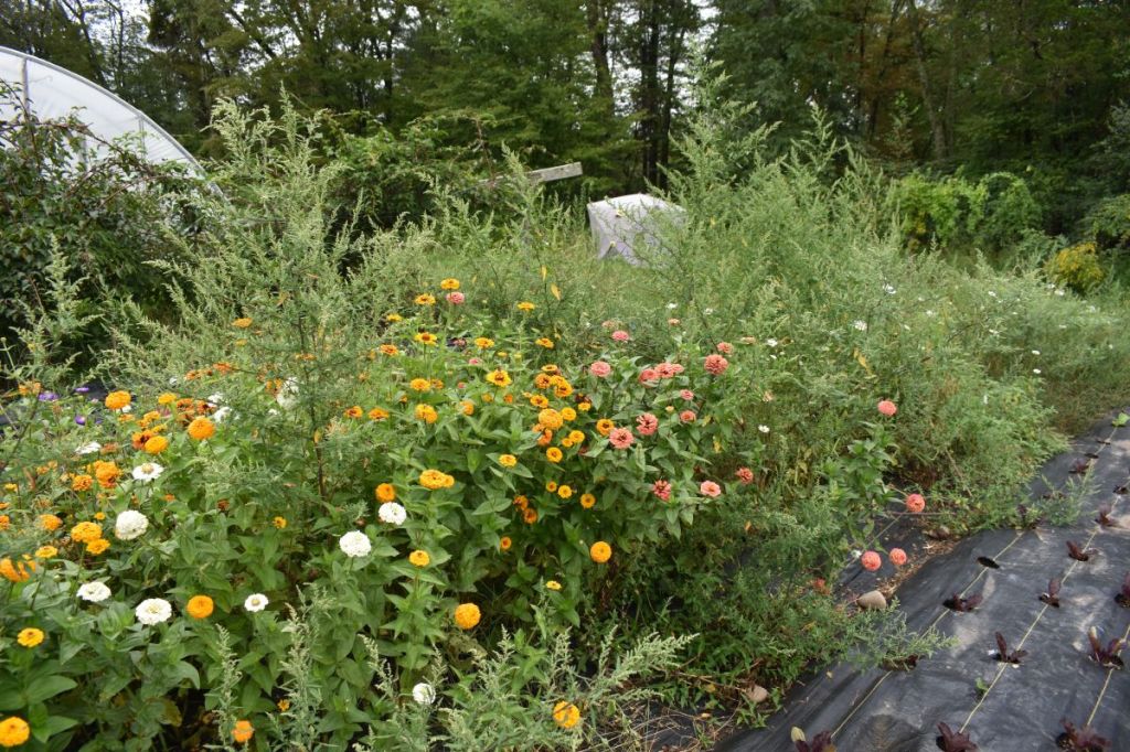 A seeded mix of Zinnia, Cosmos and Sunflowers with some true wild flowers to boot, in bloom at Rose Hill Farm.A variety of flower shapes and sizes can support a diversity of bees (and other flower visitors).