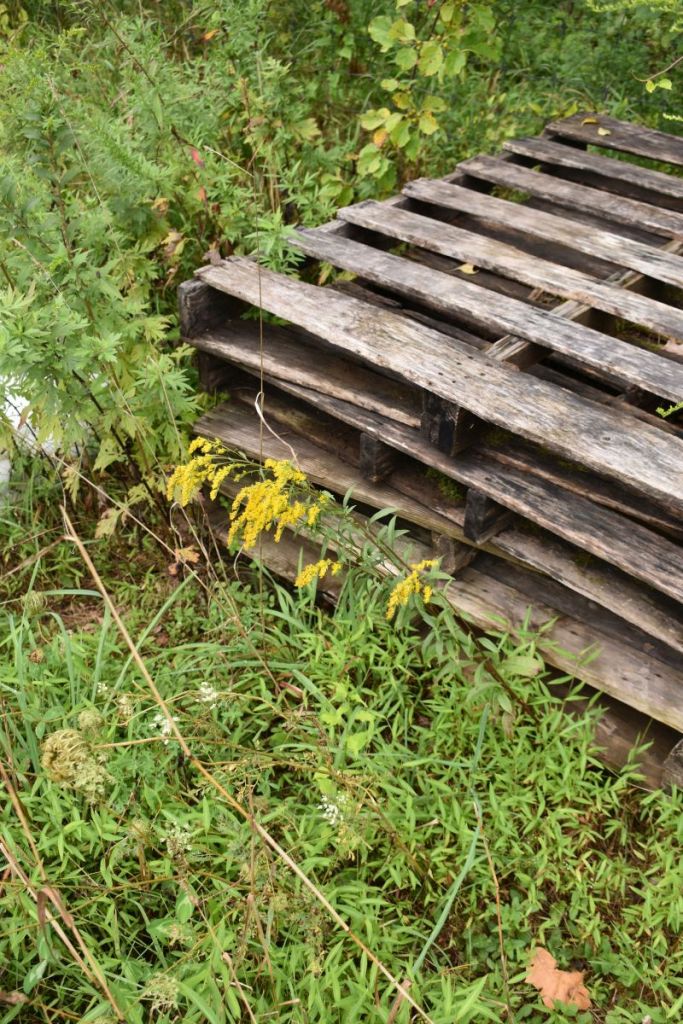However, along the south fence, we also spotted a small group of the native Early Goldenrod (Solidago juncea) growing out of some pallets. While not exactly a rare species, this goldenrod is not common, either. It does not compete well with the four rhizome-forming old field goldenrods that are generally very common in our landscape (though not at Transgenerational Farm). Note how the Early Goldenrod in the image is surrounded by the invasive Japanese Stiltgrass and adjacent to a patch of the almost ubiquitous invasive Mugwort.