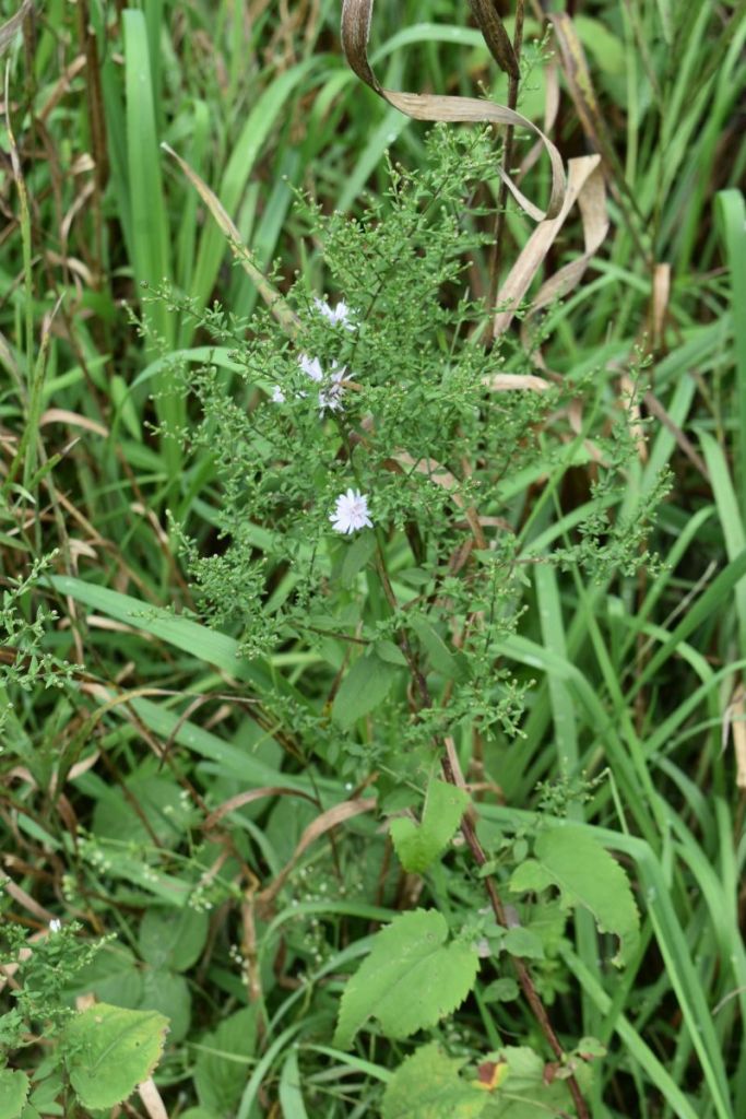 Possibly the most common native wildflower along the south fence was the light-blue flowering Heart-leaved Aster (Symphyotrichum cordifolium). It can be recognized by its large, heart-shaped stem leaves with sharply serrated margins. However, note the tiny leaves on the flowering branches!