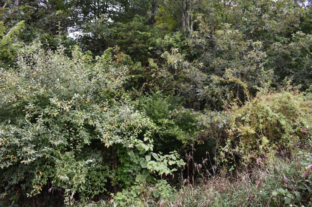 We began our survey along the west and north edges (#1 & #2) of a large tilled field. We found the usual field edge/hedgerow mix of common native and non-native plants. Half of the 20 invasive species recorded on the property were also represented in this area: Oriental Bittersweet (Celastrus orbiculatus), Eurasian shrub honeysuckle (Lonicera morrowii or L. bella), autumn-olive (Elaeagnus umbellata), Japanese Barberry (Berberis thunbergii), privet (Ligustrum sp.), Winged Burningbush (Euonymus alatus), Black Locust (Robinia pseudoacacia), Japanese Stiltgrass (Microstegium vimineum), Mugwort (Artemisia vulgaris), and Canada Thistle (Cirsium arvense).