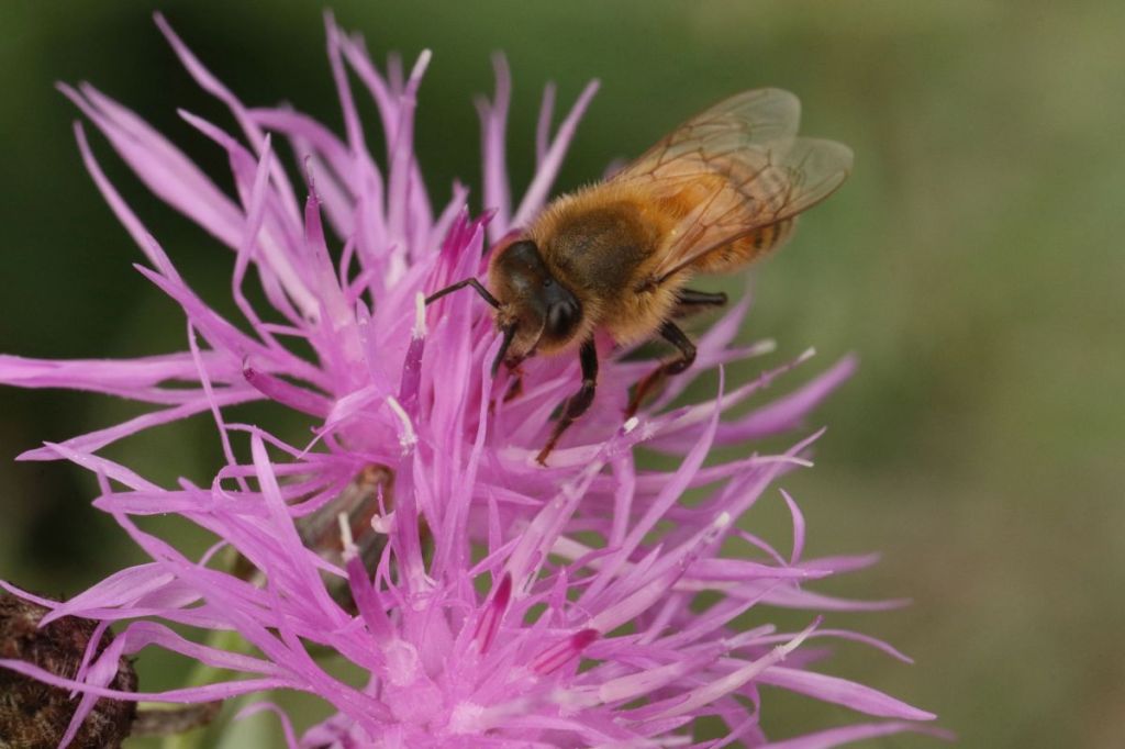 A more skilled biologist than me could have conducted detailed visual surveys that gathered both behavioral data (that is, which flowers were visited?) and biodiversity data (that is, which bee species showed up?) However, I could not do both. Instead, I identified the relatively easy groups, such as Honey Bee, Bumble Bee and a couple of others, during the surveys. I took photos of the ‘unknowns’ when I could and then went back and tried to ID those bees from images. Most bees I saw were never photographed, and thus the collection of profiles that follow is in no way a complete list. In fact in Columbia County alone we have, summarizing across various years of work done by our program, found more than 150 species of bees; I registered less than 25 species during our observations this Summer. While some of this discrepancy may reflect the limited number of habitats and dates included in this project, it also reflects the shortcomings of my technique as a biodiversity study tool. Most biodiversity assessment studies use trapping of some form. Using photographs and visual tallies, I often can’t determine the species and below I’ll often talk at the broader scale of genera (genera are higher levels of biological organization than species; for example, wolves, coyotes and domestic dogs, while different species, are all members of the genus Canis).
