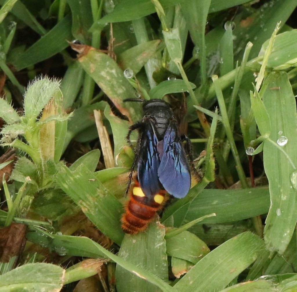 Blue-winged Scoliid Wasps follow a slightly modified version of the Four-toothed Mason Wasp’s game plan. Like the previous wasp, the adults feed on nectar and pollen, hence the first image of them on flowers. But their time on the ground, as in the above photo, is spent looking for beetle grubs, specifically those of Japanese Rose Beetle and the Green June Bug. Once found, the grub is again paralyzed and an egg is laid upon it. On hatching the wasp larvae feeds on the adjacent grub. Again, since white grubs and Rose Beetles in particular are often considered pests, seeing a bunch of these likewise mild-mannered solitary wasps is an indication that biocontrol is in action.