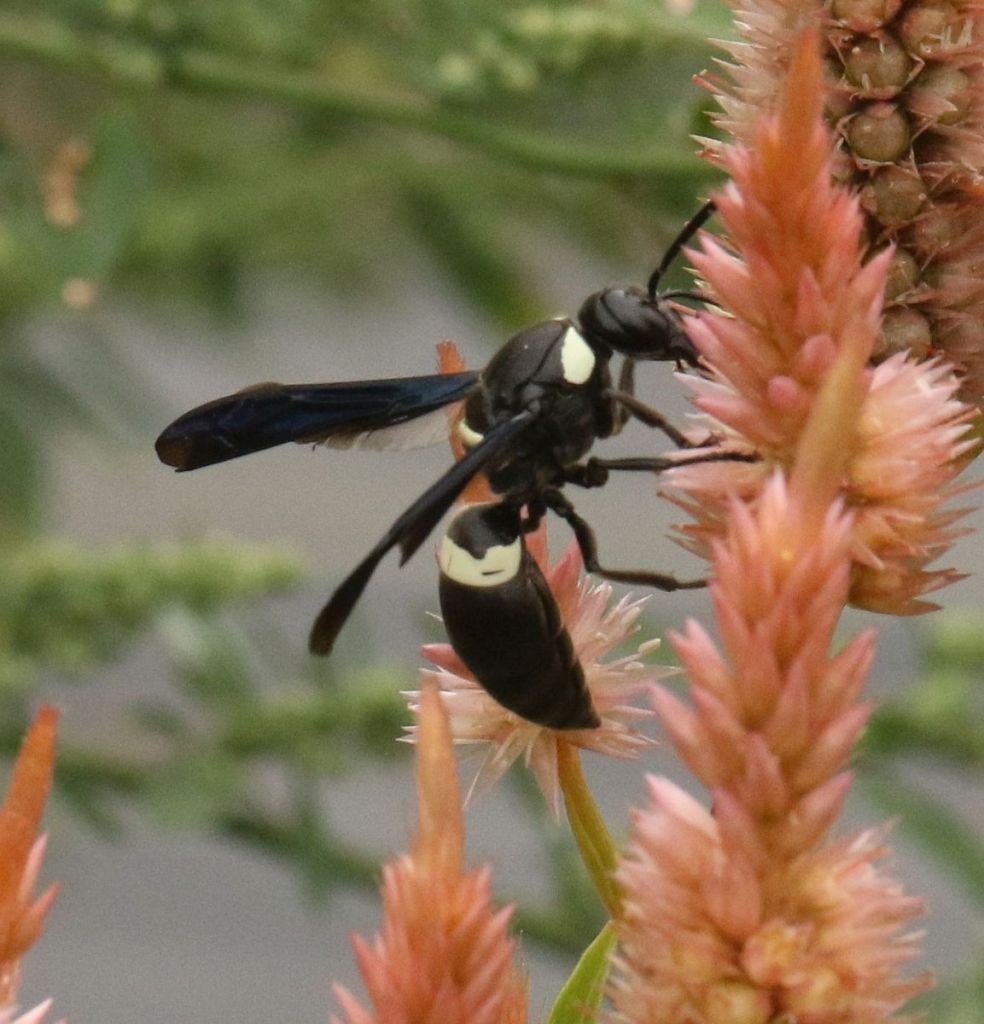 While adult Four-toothed Mason Wasps primarily feed on nectar and, perhaps, pollen, they prepare their young for the World by supplying the burrow-nursery of each cossetted egg with a live, but paralyzed caterpillar. When the egg hatches, the larva devours the caterpillar. Given that those caterpillars can sometimes be agricultural pests, such wasps have generally been classed as beneficials. Clearly, agronomists, not moths, are making that call.These elegant wasps, Blue-winged Scoliids, were very common during our visit. Indeed, whether it was season, weather, and/or ecological ambience, Transgenerational was where I saw the most of them.