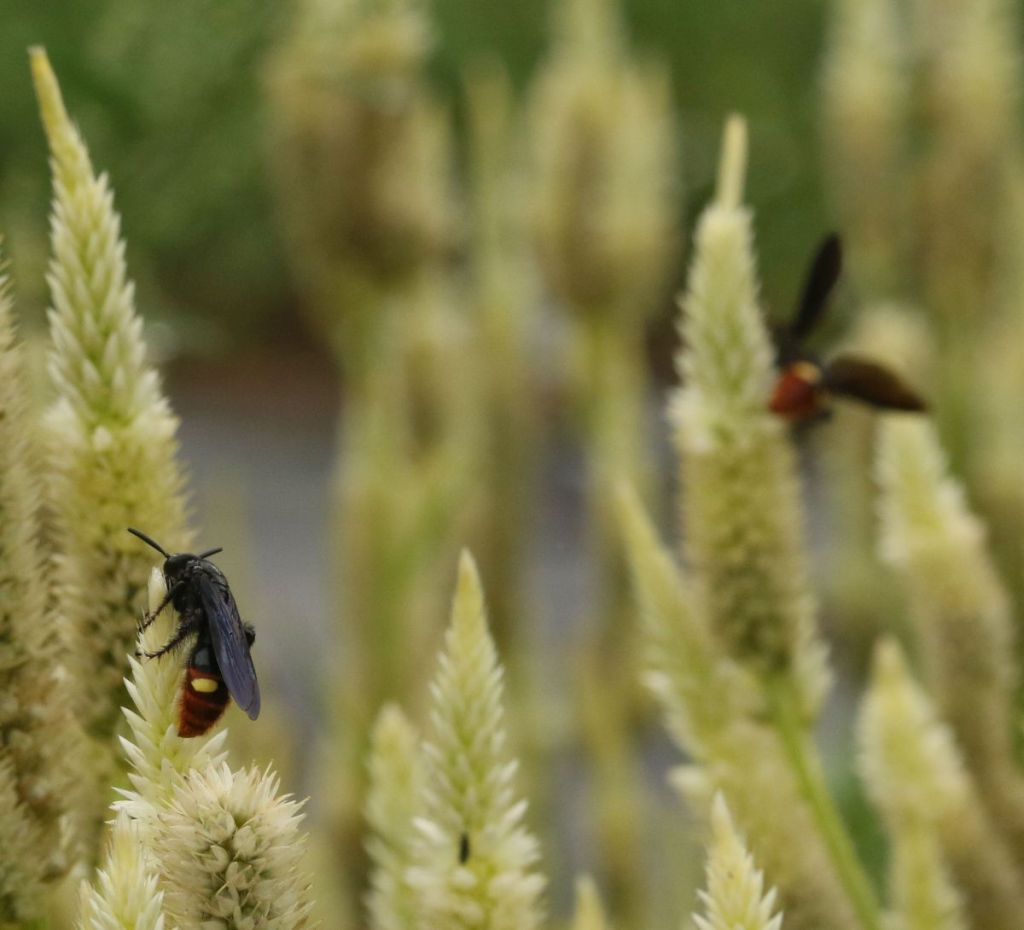 Melissodes tend to be late-season flyers and do seem to specialize somewhat by flower type, with our most common regional Melissodes seeming to favor Sunflowers. Our own observations supported this preference for Sunflowers, but they were also seen on a range of other flowers including, amongst seeded flowers, Bachelor Button, Black-eyed Susan, Blanket Flower, Brown-eyed Susan, Celosia, Coreopsis, Corn (!), Digitalis, Echinacea, Marigolds, Spearmint, Statice, and Zinnia. Among wild flowers, these bees were found on Chicory, Cosmos, Joe-Pye Weed and knapweeds. As this list suggests, many of these bees seem particularly fond of flowers in the Aster family, squash bees being an obvious exception.